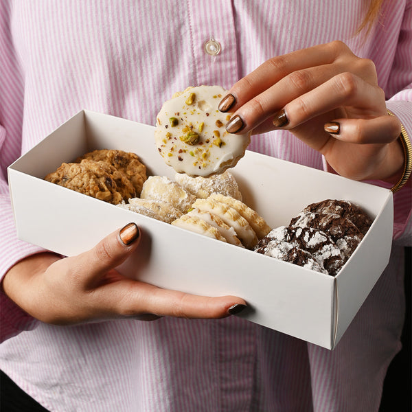 CONTIENE:Galletas de mantequilla con limón y pistache.Galletas de avena con pasas.Bolitas de nuez con azúcar glass.Galletas de brownie de chocolate.