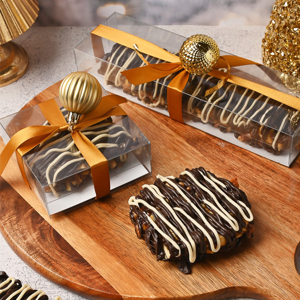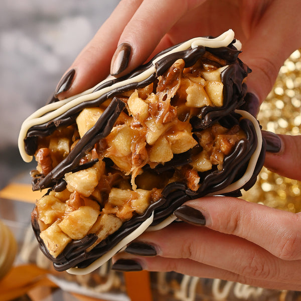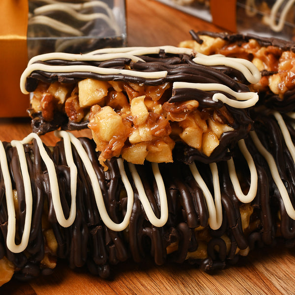 Dulce de caramelo con trozos de manzana deshidratada y nuez envuelto por chocolate oscuro y blanco.