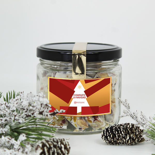 Chocolate blanco con una mezcla de frutos secos: chabacano, arándonos deshidratados, pistache, nuez y almendras,