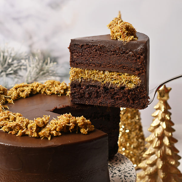 Tres capas de pastel de chocolate relleno de pistache, kataifi y queso crema.